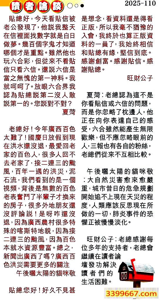主题 :110期:彩民推荐〖貼信讀者論壇〗 |