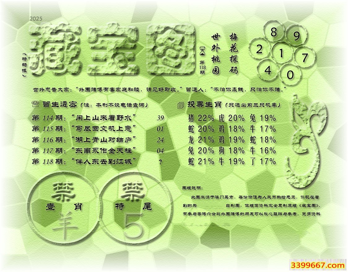 118期藏寶圖 新:苏小门前万缕垂 老:伴人东去到江城 禁:羊 禁:5尾