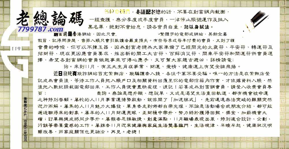 | 主题 :119期:六合皇金句/老总论码/萧公子/林大师/五行夺码/老总信箱截 |