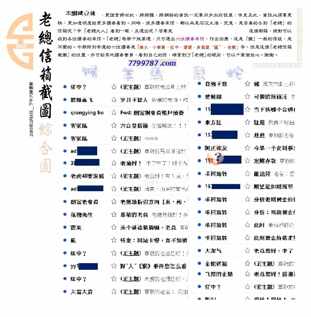 | 主题 :003期:六合皇金句/老总论码/萧公子/林大师/五行夺码/老总信箱截 |