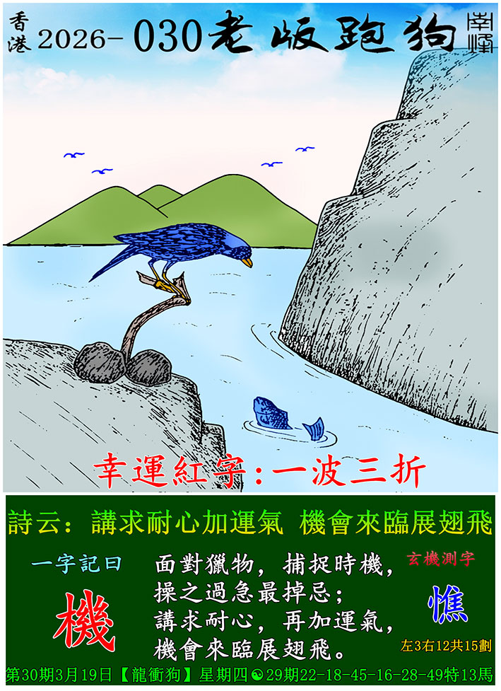 030期老版跑狗一字記之曰:【機】 詩雲:講求耐心加運氣,機會來